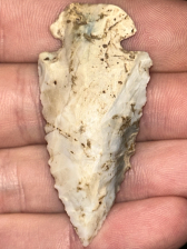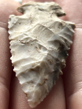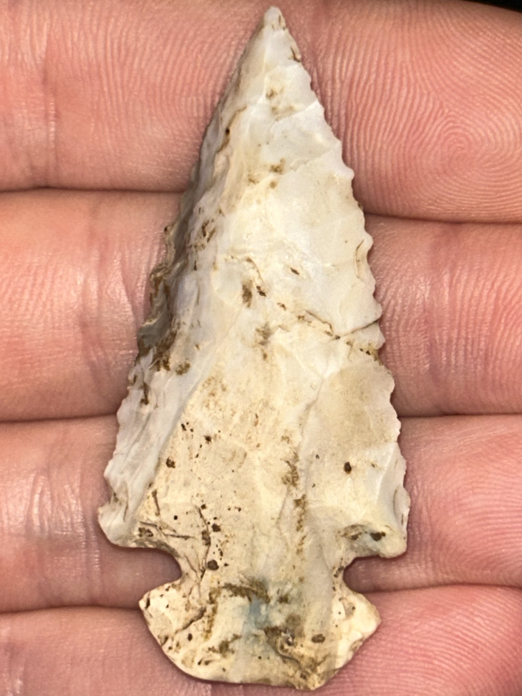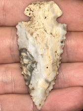 A fabulous Dovetail found in Jefferson County, Illinois. Made from glossy high grade blue and white Burlington chert. Great smaller form with well ground base and serrated edges.