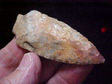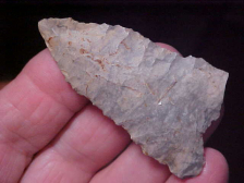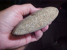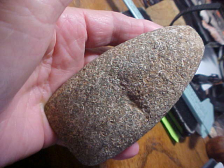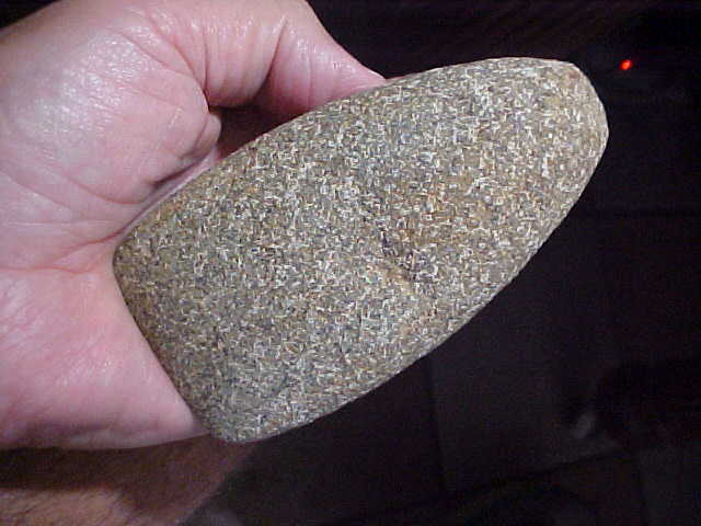 A granite Woodland Era Celt from Vanderburgh or Posey County, S.W. Indiana--FIELD found--as the plow creases demonstrate, but just to find a 4&7/16" by 2&5/16", 1&7/16" Celt in plowed fields anymore is an accomplishment. To its credit, if you rub the bit it's some impressive bit-edge polish. How many hours it took to give the front inch (plus) that strong of a polish must have required some effort...not a ten minute job, definitely. Note on the one face there is a built-in 'slot' for a celt head tightening wedge--a wood or bone wedge could be inserted to hold the chopping head tighter--as needed---read that 'as the sinew stretched'. The two thousand year past toolmaker planned ahead, give him credit. Due to weight priority mail shipping, $11.00, and payment is limited to checks (cash) or M.O.s--I do not use paypal--Roy A.