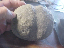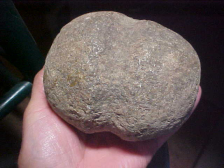 Either a Greenstone or a green quartzite, heavy rascal. No matter the length of the handle this Maul was mounted on, swinging it was a recipe for sore shoulders that night. Out of the Sangamon County, Illinois, area the green 'quartz-like' stone is (just guessing) about four lbs--length is 4&5/8" by 3&15/16", 3" or fractionally over in height. The patina is there, it's 100% real. The finder had a lot of white flint in his collection, but nothing else like this big "warclub"--authentic, and a neat piece in anyone's collection. Shipping is $13, checks or M.O.s are the two ways to purchase it as I do not use paypal-type services--Roy A.