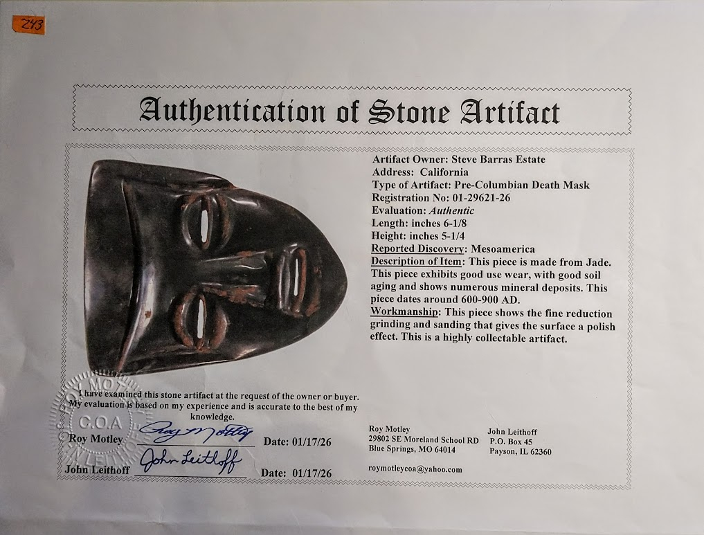This phenomenal Pre-Columbian Death Mask is made out of a rare, green, semi-translucent Jade. It's likely from the Mayan/Olmec cultures where it was believed that the transformation of the deceased into spiritual beings was facilitated by these masks, which embodied both the physical and spiritual aspects of the individual. At over 6 inches in length and over 5 inches in width, this mask is very large for its type and thin enough to easily show its translucence when backlit. It is a fantastic piece of artwork and available at a very reasonable cost.