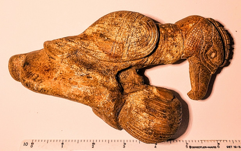 This is a very unusual Pre-Columbian Bone artifact of a Peruvian Vulture eating a Monkey. It is highly detailed, showing intricate features of both creatures. For those of you who collect unique items, this work of ancient art certainly fits the "Bill." The head of the vulture was broken off at some point in the past and was repaired with minimal restoration, as set out on the Roy Motley COA accompanying this authentic piece. You'll never find another piece like this, so don't let it get away!