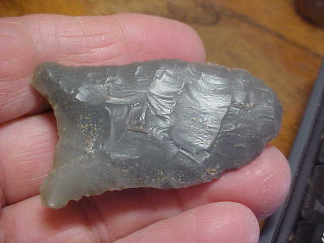 This Quad was purchased from the Kentucky finder, R. Travelsted,(sp) Livingston County, far western Ky--it's been a part of my collection for better than few years--visually, the very high grade of Hornstone--almost to the color of Kentucky Blue Flint, the knapping work, form and patina, they all come together in this 2&3/16" by 1&5/16" Paleo. Basal and lateral grinding, they're decent--not super ground, but definitely they ARE ground. Knapping scars, some extend past the medial ridge, the "overshot" flaking found on Paleo points--outre pas flaking. Was the piece once much longer, resharpening (ancient) and shortening of the blade were what resulted in the angled flake that makes the tip (on one face)--or was this the original form. Honestly, I think you'll get different opinions depending on the collector you talk to. One thing is evident, the leading edge, while not a sharp "V", is a sharp edge--to avoid losing blade length the Paleo may have decided against narrowing the blade to get a more pointed tip--that is, they wanted the wider blade for more 'cutting surface'--that's my theory, anyway. Every detail is guaranteed real, period. I pay the shipping cost, and I take payments by check or money order. Sorry, I do not use paypal-type services--Roy A.