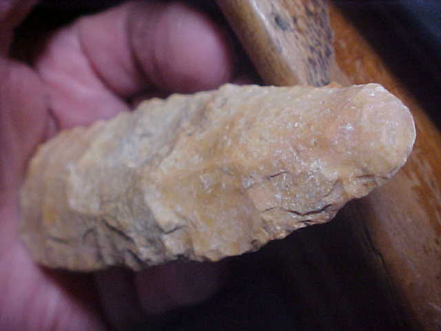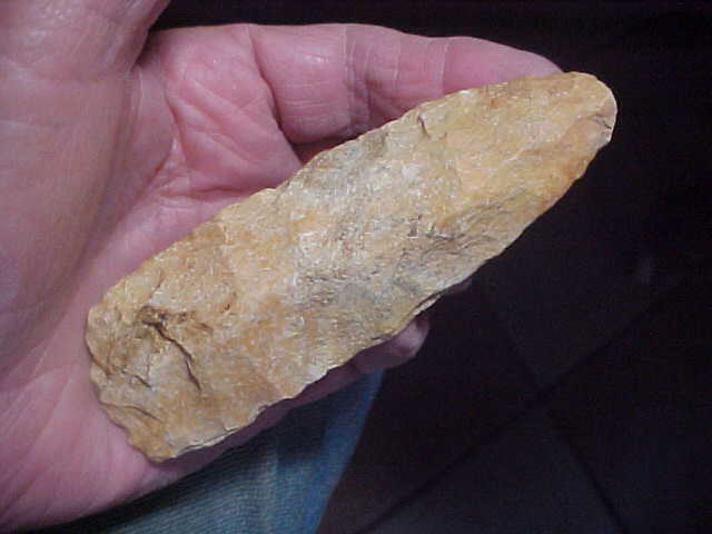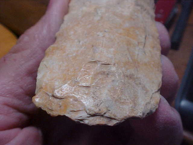When you see the polish on the leading edge flakes you know a flint tool has seen plenty of use--and Kaolin Flint, both Hopewell and Mississippian Cultures favored this S.W. Illinois flint for color and gloss (once used for a period of time--some Kaolin Celts, they polished (by grinding) the bit to a very high gloss--sometimes, they did so with the entire Celt--those are works of art if you google them. This particular Chisel is right under 4&1/2" by 1&7/16" and a 3/4" max thickness along the medial ridge. The 'heel' ("poll" end, some call the the heel) is also polished to a degree. The piece comes out of a Bond County, IL, collection, but not tagged for that west-central county--could have been found there, or bought, but patina does say every detail is real. That's fact. Shipping is $8.00, checks or M.O>s are how I welcome payments. Sorry, I do not use paypal-type services--Roy A.