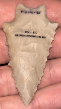 A fabulous Stemmed Kirk found in Henderson County, Kentucky by Robert Doyle in the 1980s (exact location available to buyer). Made from pale grey Hopkinsville chert with good mineralization. Well made with classic form and serrated edges. Ex: Brandon Vanderver.