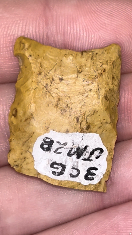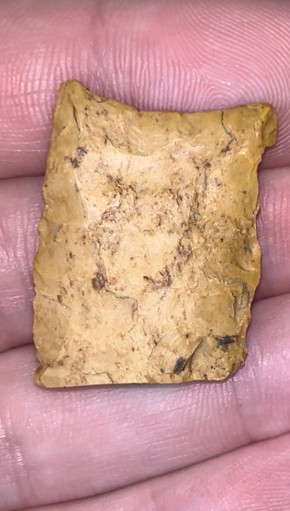 A nice Clovis base, find location unknown. Made from a heavily patinated golden yellow chert. Good grinding and light fluting on both sides.