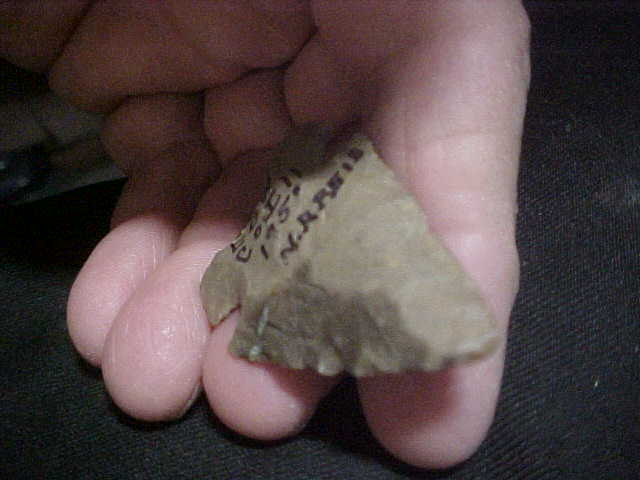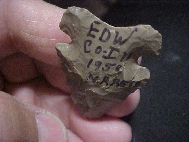 An Edwards County, Illinois, find by Norman Reid, 1951 if I'm correct in reading the year Norman notated on the point (the last digit is either a 1 or a 6). The 1.75" hornstone point, whether you wish to call it a Contracted Base Big Sandy or a Graham Cave---or even an 'exhausted Thebes', it's in that very early part of the Early Archaic Period--7500--8,000 BP. Basal grinding is excellent, the tip has a "Thebes-like" twist to it (see pic) that only comes with extensive sharpening of the blade. The tip has some rub polish to indicate the end was used as a buffing tool after there was little cutting edge left to the knife. The full provenance of the piece will be on the printed out item description when I ship the piece. Shipping is $8.00 with checks or M.O.s how I welcome payments. Sorry, I do not use paypal-type services--Roy A.