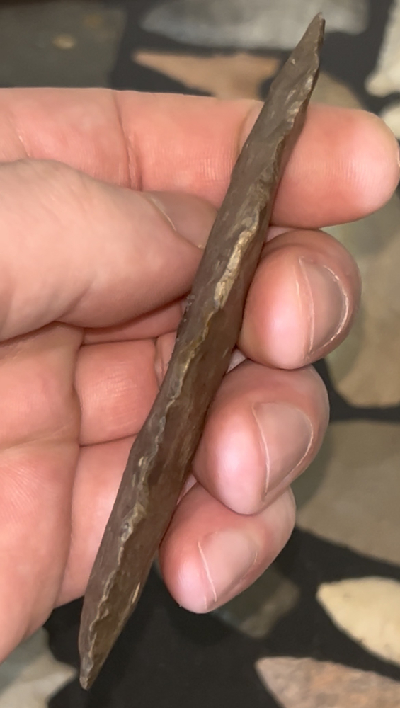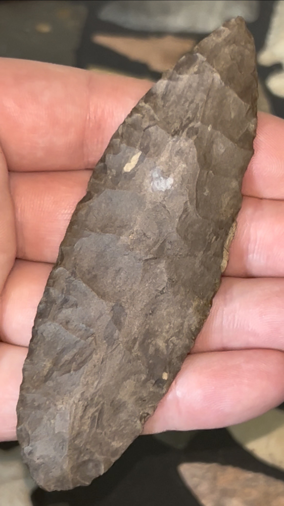 An excellent bi-pointed blade found in Montgomery County, Tennessee. Made from mottled brown Dover chert. Thin and well made with good size.