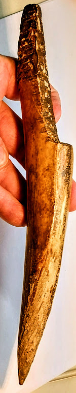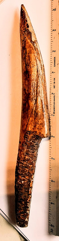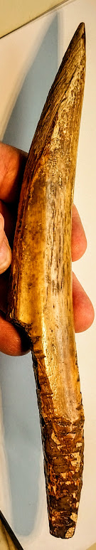 This Fossil Ivory Walrus Tusk was hafted by Eskimo hunters who attached a long wooden shaft to it. It was used to test the ice while hunting. It was found on St. Lawrence Island, Alaska.