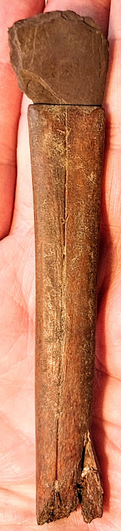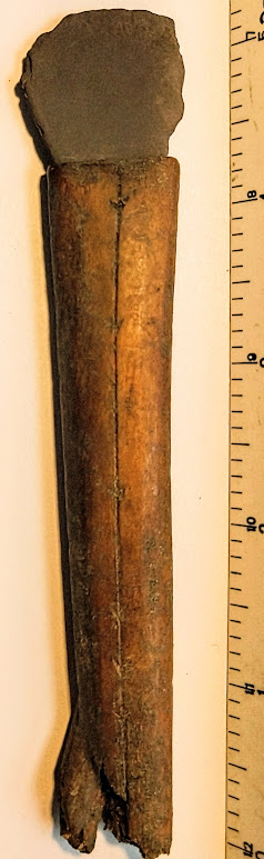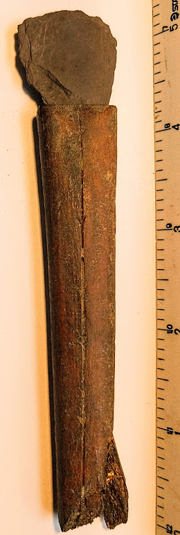 This Eskimo Fossil Bone Hafted Scraper has a slate head inserted into the bone. It was used to remove hair and meat from hides. It was found on St. Lawrence Island, Alaska.