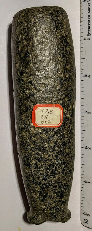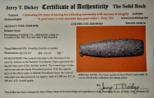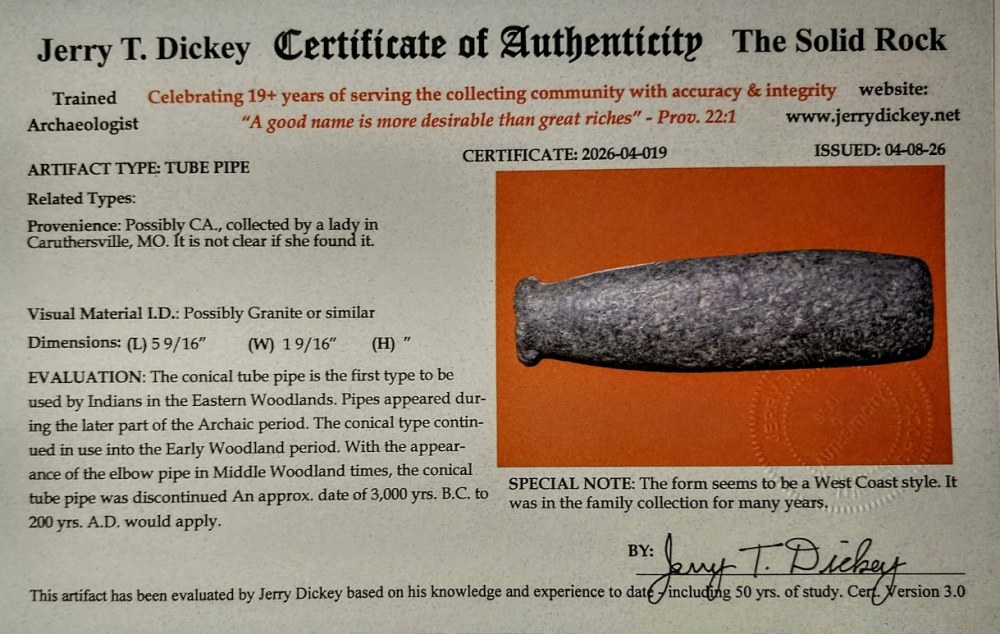 This is a spectacular example of a Large, Granite Tube Pipe of a West Coast style. It was in a Missouri collection and comes with a Jerry Dickey COA. Mr. Dickey feels that this is a West Coast style pipe. Regardless of its origin, it is a unique and rare type of artifact.