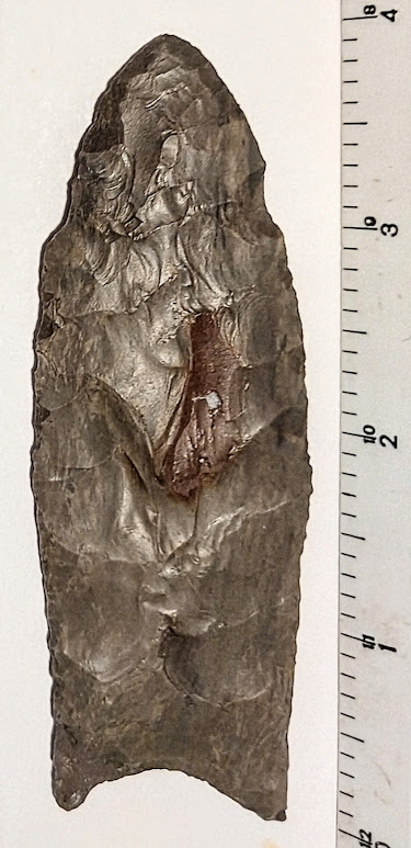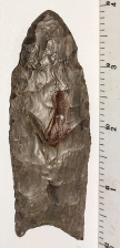 This Large Dover Chert Clovis has a restored ear and a tip that has been rechipped. Because of these problems, this Clovis is a very affordable example of this rare point. This Clovis was found in Ohio, and comes with a Jerry Dickey COA. It was formerly in the collection of Walt Macintyre.