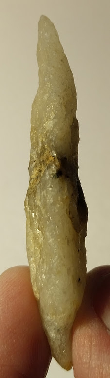 This Middle Archaic Appalachian Point is made out of semi-translucent quartz. This symmetrical point was found in North Carolina. Quartz from this area is extremely hard to work with, and the maker did a great job with this piece!
