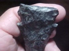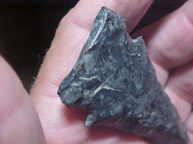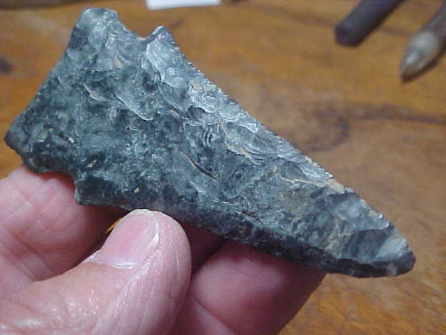 Was this Allen County, Indiana, Thebes made with a full base, or was it edge-fractured in Early Archaic use--I'm not sure, I think a person could make a case for either case--I lean towards the blade never having full basal lobes. The basal edge is ground smooth for hafting the big knife, though, and if the Thebes knapper made a knife as large as the flint preform would allow, he left no room for full basal "lobes", he knapped to the very edge of the starting piece of Ohio Coshocton Flint, that's make sense. You'll have to decide for yourself, but the patination of the flint is absolutely ancient, guaranteed so. Length is 3&1/8" by 1&7/16", the thickest spot barely over 5/16". Note the tip is intact, the pics (hopefully) showing a band of a higher silicate material (quartz) in the darker matrix--and a tiny, dark actual tip--neat feature, IMHO. Shipping is $8.00, checks or M.O.s are how I take payments--sorry, that means paypal-type services are not used--Roy A.