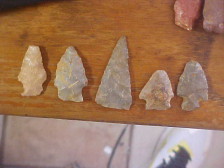 A mix of Harrison County-quarried Indiana Hornstone and Perry County, IN Derby Flint--along with a couple that are made of river pebble Red Jasper--easy to recognize those by their color. The longest point is a hornstone Snap Base (salvaged and edge-polished by the Woodland Culture user) Buck Creek point, not quite to 1&3/4"--very thin for the length of the point. The Turkey Tail point made of Derby Flint is another that was heavily used and salvaged (as they so often did), 1&7/16". The mottled-color bifurcated Kirk Stemmed is another very thin piece--the flint may be in the Spencer County, Indiana, found "Holland Flint" family--that's as close as I can classify it--unusual color for 'Holland', but ancient hunters, tracking deer through area creeks would stumble on small flint outcrops, take "chert samples" home for the village knapper to work. Maybe, if he approved, they went back for more--but sometimes you find only one or two pieces (on a campsite) and try your best to identify who/ what/ where. These ten come from an Evansville, Indiana, area collection, each is guaranteed real. Shipping is $8.00 with payment to be by check or money order. Sorry, I do not use paypal-type services--Roy A.