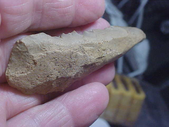 One of the best 'Ridge Back" Paleo work tools I've had in-hand lately--a Southwest Indiana find made from a hornstone/ cortex flint, 3&3/4" by 1" with that semi-curved shape, scraper tip to deliberately flat 'heel'. On what I'll call the 'spatulate end' you'll find Paleo use polish on either side of the "V" shape. What I'll describe as 'heavy polish' also is found on the flat side of the narrow end--see the photos, the flint has a gloss from extensive use/ wear. As found on many Paleo ridgeback tools the 'ridge' is a deliberately flat--almost 'fluted' channel--hopefully the photos will show some of those features. The only damage is a small surface flake in the center of the inside edge, you can contrast the patination of a chip versus the surrounding heavy patina---sometimes a chip, a ding, it shows you the authenticity better than any description I can provide. Shipping is $8.00 with checks or M.O>s the ways you can pay. Sorry, I do not use paypal-type services--Roy A.