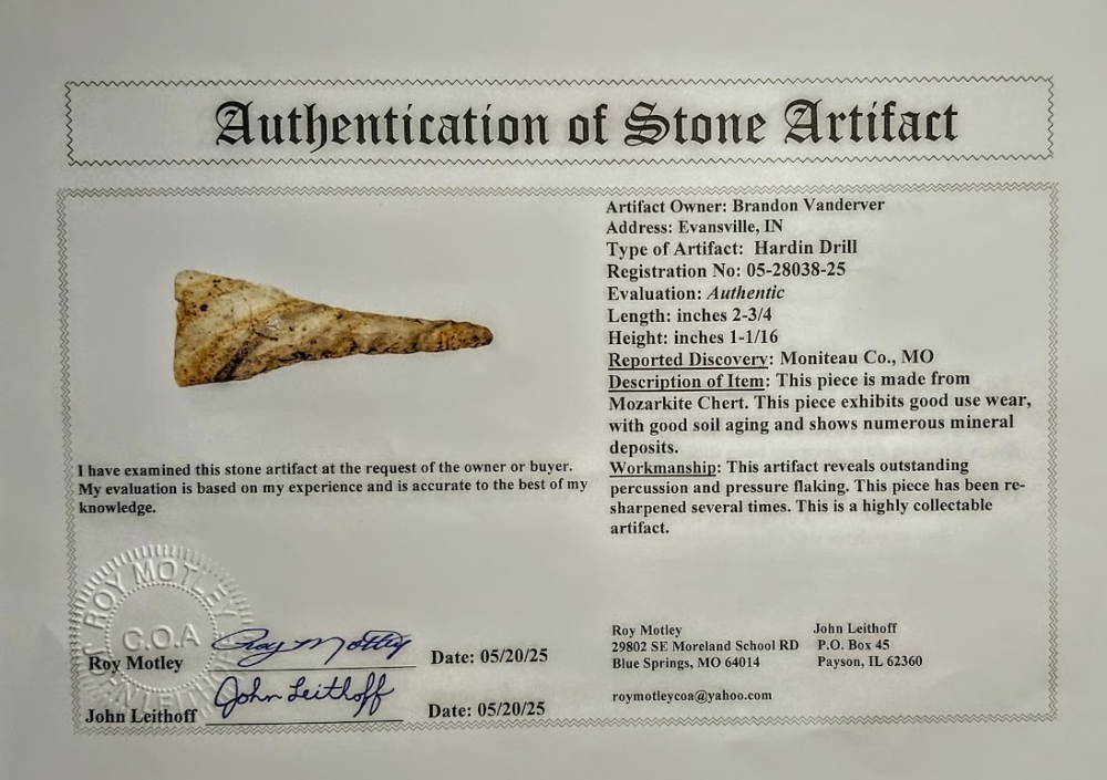 This symmetrical Hardin Drill is made out of Mozarkite. It was found in Moniteau Co., Missouri, and comes with a Roy Motley COA. Hardin drills are rare, especially ones as attractive as this specimen.