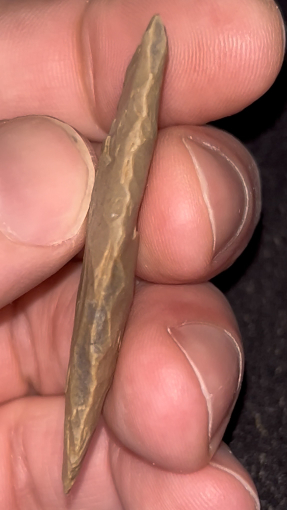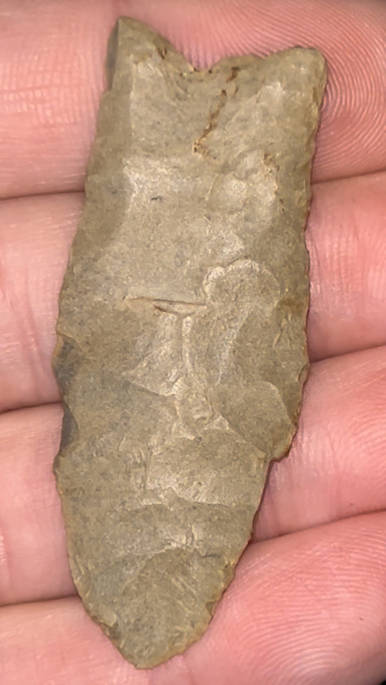 A very nice Clovis found in Kentucky. Made from grey Fort Payne chert that is heavily patinated to a medium brown, as evidenced by some small nicks around the edges, with excellent mineralization. Thin and well made with nice narrow style and light fluting on both sides.