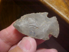 Found along the Ohio River in the S.W. corner of Indiana, Vanderburgh or Posey County, this Hornstone Hopewell measures exactly 2" by slightly over 1&1/4"--VERY symmetrical in form and thickness (3/8"). The point has been in my collection for a while simply because of that fine symmetry. You can see the one small nick up near the tip, not sure if it was a bit of flint that broke off with freeze-thaw as it's be an odd spot for 'use-damage' to a knife, being so rounded. Both barbs are intact, the one just looks like the Woodland Culture knapper was fighting with 'stacks' in the flint...places where the flint had a 'grain' to it. What I'm trying to describe is flint that cooperated (with the knapper) in most areas, but presented challenges in others. The Hopewell artisan who made the point, he did a pretty decent job of it. One note--I've never washed the surface sandy soil off the point, put it under a 10x loop, you'll see that. Shipping is $8.00 and payment can be by check or M.O. as I do not use paypal-type services--Roy A.