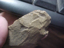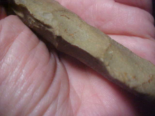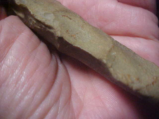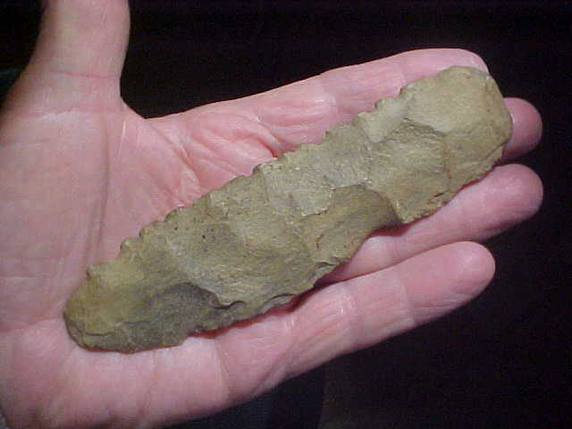 One big, big piece of flint, so much patina I'm going to stick with "tan chert" as the flint identification; length is close to 5&9/16" by 1&7/16", the thick medial ridge reaching 11/16" max thickness. The piece is out of a S.W. Indiana collection, could be an Indiana find or a Kentucky creek find, it wasn't marked to tell us--authenticity is no brainer, whichever creek produced the find. Features: the chisel end shows strong use polish to the thinner end, flint took on a polish (see the close up, you can see the gloss from use as a chisel) Next is the serrated edge. That sort of serration is very unusual on a hand held tool, big "key hole' type notches. Too, there is an indented shaft scraper (or bone scraper) on the top edge--really a multi-purpose tool. One specific feature I've been experimenting to understand--HOW did they hold the piece--obviously you don't want to be gripping the serrated edge, so how'd the piece fit their hand? And which hand, generally you could tell if the user was right (or correct) handed. I haven't worked that one out--experiment, you may be the one to figure how the tool was used. One small note--on the chisel end, away from the serration, there is a deliberately ground-smooth finger tip hold--I think it's a reasonable guess that that one spot tells us at least one of the ways the serration was used. One fascination artifact, I think, real in every detail. Shipping is $9.00 due to the weight, checks or money orders are the only way to pay for the piece. Sorry, I do not ues paypal-type services--Roy A.