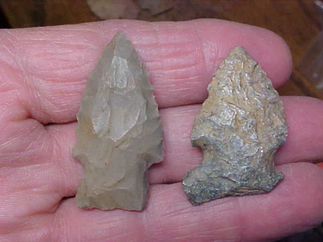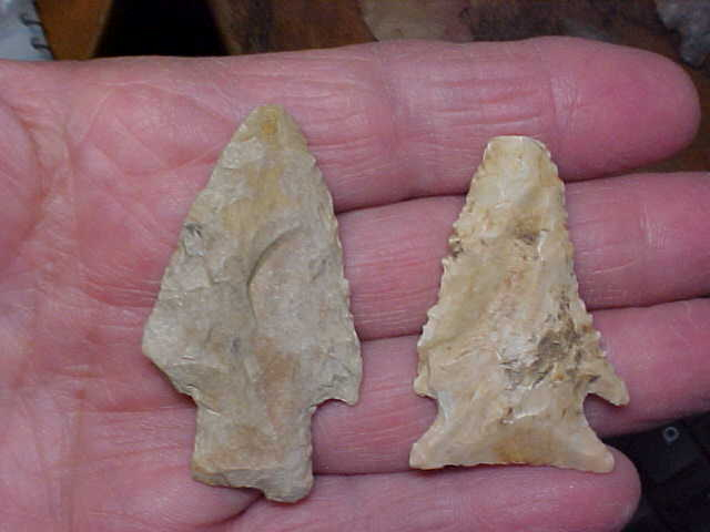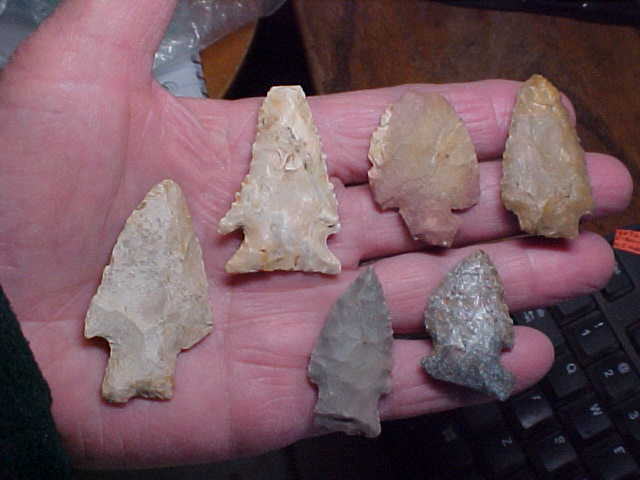 Shipping is included with the group of Early archaic Culture points from S.W. Indiana. These are as-found, so any damage was use-made. The longest is 2&3/16", a fossil chert either Heavy Duty or Hardin (I go back-and-forth with classification each time I look at it)--stem grinding is there, but it seems wide for a Heavy Duty. The Holland, Indiana, chert Pinetree lacks a tip but still measures 1&7/8". The red/ greenish-tan Thebes is 1&5/8"--shame about the tip and base, but it's "as found"--THIN, only 3/16".The Kirk Stemmed-Serrated is 1&3/4", the hornstone Palmer is 1&11/16", and the fossil chert Big Sandy is 1&1/2"--shows considerable ancient use with that polish. ALL are guaranteed real. I welcome checks, cash, or M.O>s, but do not use paypal-type services--Roy A.