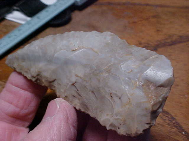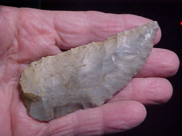 The flint is our Hoosier Spencer County, Indiana, creek-found Holland Chalcedony--the knife also found there in Spencer County. Length is 3&11/16" by 1&1/2", 7/16" thickness on the medial ridge. culturally, the curved knife is Early Archaic in time, 7500BP--pressure chipped, patinated, worn with long usage. As the 'crescent' shape is slightly unusual, I expect the piece started as a rounded-base Cobbs Knife, but the sharpening, done on one face for the most part, slowly rounded that main cutting edge--see the backlighted photo, you can spot the yellowish patina from the long use. Good piece of flint, I think, REAL in every detail. Shipping is $8.00 with checks or M.O.s the ways I welcome payments. Sorry, I do not use paypal-type services--Roy A.