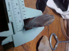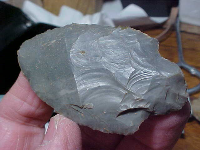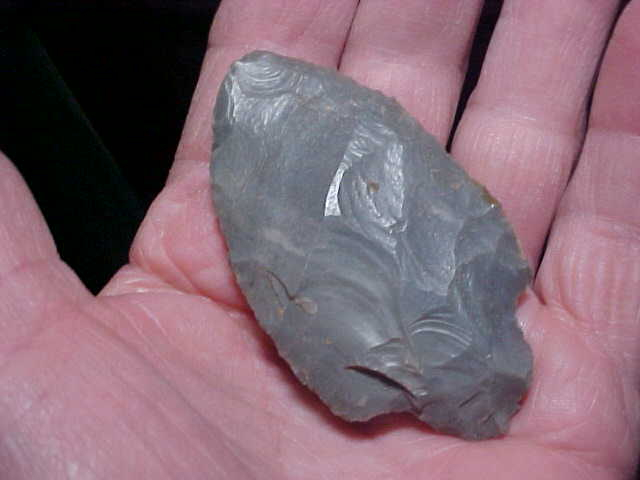 Most generally I'll start an item description with the where-found, but when there is an unusual feature, maybe that's the place to start--THICKNESS is 9/16" (that's not a typo)--I've had this Adena in my hands quite a number of times now, and still can't provide a good answer why it was made so thick--almost like the knapper took a cache blade and forced a stem. The fact that the point/ knife was lost there on the Perry County (or Spencer Co.), Indiana, camp debris, washed-out by spring floods, well it may have proven to be a one-time-use, the knife abandoned because they couldn't thin the blade without considerable narrowing--the only way to thin a blade, flint knappers tell me. Not being a knapper, I rely on the info I get from people who specialize in studying the techniques of ancient peoples. At least two of the major authenticators in the country are also students of knapping--knowledge they put to use when authenticating. Okay--length is almost 2&15/16" by a wide 1&11/16"--interesting Adena, 100% real. Shipping is $8.00, checks, cash, or M.O.s. Sorry, I do not use paypal-type services--Roy A.