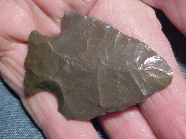 The polish is ancient--Hopewell work, not modern--I tried every chemical from Acetone, alcohol, brush cleaner (toluene) I could think of--I've done a lot of painting, have a good idea what cuts through anything applied to the surface of flint. This polish is from ancient rubbing, it's not an 'add on'. best guess I've come up with is that the Hornstone Snyders, Massac County, Illinois, was rubbed against leather, over-and-over...likely on a snowy day like today, someone stuck in a hut, waiting for the weather to improve. Length is 2&1/4" by nearly 1&5/16"--slightly over 5/16" max thickness. The finder gave me the provenance, so I know it's an Ohio River beach find--real in every detail. The barbs and the tip show minor wear, but it's the polish that makes the piece collectible, I think. Shipping is $8.00 with checks or M.O>s welcomed. Sorry, I do not use paypal-type services--Roy A.