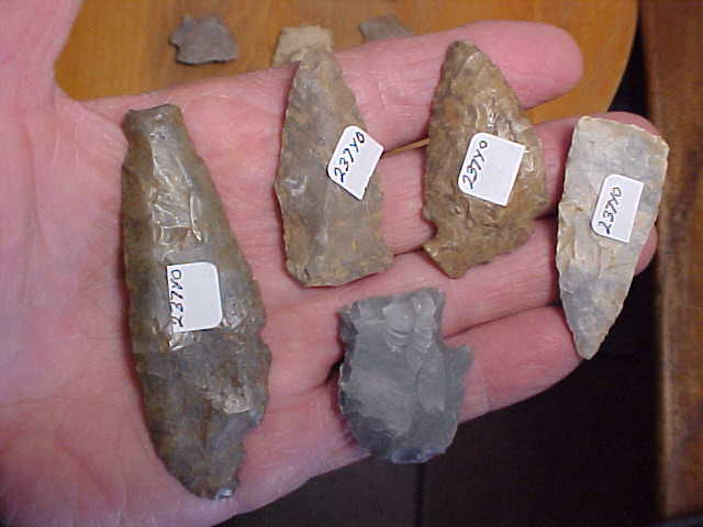 Ten points found around the Monticello, Indiana, area-- area flints like Kenneth Chert, some hornstone that made it that far north, and some Burlington Chert that strayed east--interesting, low priced, authentic. The longest is the Hornstone knife at slightly under 3&1/8". Shipping is $4.00, checks, cash, or money orders any of the three are welcomed. Sorry, I do not use paypal-type services--Roy A.