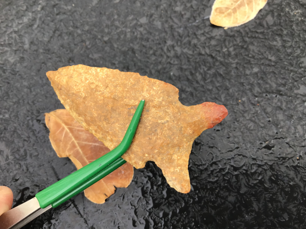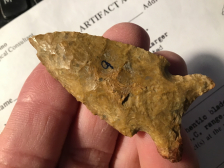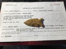 Well patinated with a ground base and stem and left hand bevel. Made of Bailey chert, it has a nice fish tailed base and comes with a Perino coa. I have the shipping.