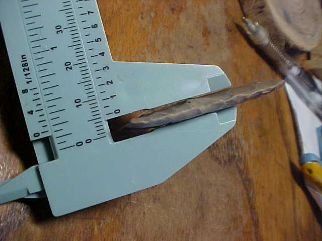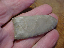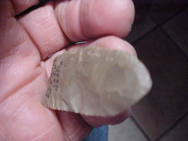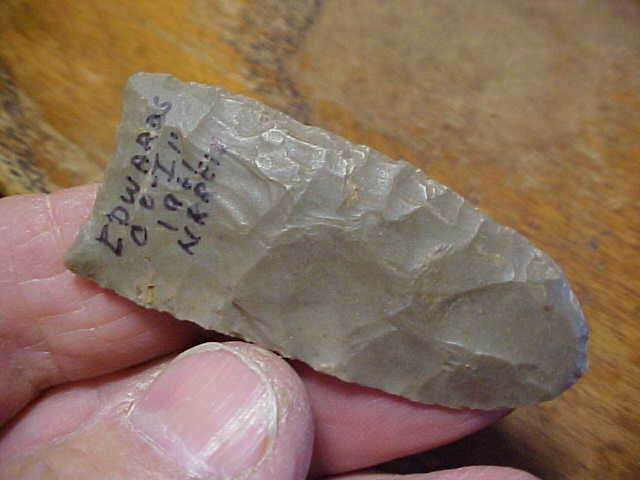 A Clovis I 'put back' a few years back, ex Norman Reid Indian Hill Museum (private museum) in Bone Gap, Illinois. Norman marked the point as having been found in his home area, Edwards County, Illinois, in 1961--he signed most of the pieces in his collection, at least the ones I added to my collection--good provenance. This really, really thin Paleo measures 2&1/8" by 15/16", the blade barely reaching over 3/16" thickness in the very center, then thinning to both base and tip. One lateral edge shows good grinding, the other edge you detect grinding only on the bottom 3/16" (a small chip in the side, so small it may not show up in the photos. The basal edge, while it does show 'flute-like flakes' has very little basal grinding--grinding isn't absent, it's just barely dulled. The toning of the flint is consistent with Illinois Hornstone--Cobden Flint. Note the tip, it has almost a 'beveling technique' to get a sharp point--that method having been done as the piece is so thin there. Every detail, patina and form is consistent with the Late Paleo Unfluted Clovis--i.e. it's real. Shipping comes with the price, checks or M.O.s are how I welcome payment. Sorry, I do not use paypal-type services--Roy A.
