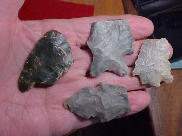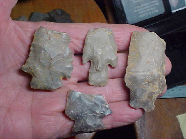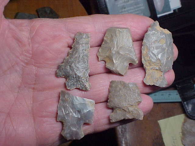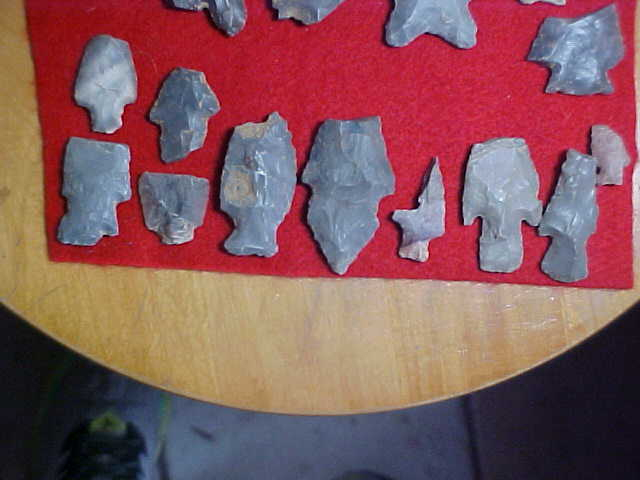A frigid morning, nothing better than to pull out a box of Daviess County, Kentucky, flint, see what remains--most are Indiana Hornstone (the flint source not that many miles up the Ohio River in Leavenworth, Ind.), and then some Sonora Flint (5 or 6 pieces are Sonora, pictured separately). You'll spot a few Late Archaic (Turkey Tail), and a couple small Rivertons, a Buck Creek along with some other Woodland types--again, a separate picture, but it's the Early Archiac point type bases that are--at least to me--the most interesting to study. When you know what a 1000% real Early Archaic base looks like you can always adapt that knowledge to more complete pieces---that's how I was taught, at least. Any questions you might have, hey, send them by Email, text, or "Ask seller a question" link--I'll do my best to answer. Shipping is $11, checks, cash, money orders are the three ways I take payment. Sorry, I do not use paypal-type services--Roy A.