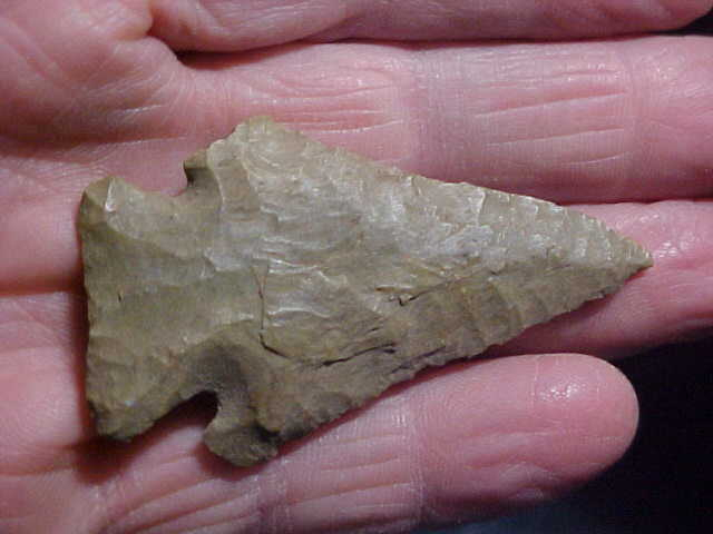 If there was ever a piece worth sending for restoration, this would be high on my list. Sure, the Early Archaic "Pinetree Culture" salvaged the barb some, but he was interested in a functional hafted knife, not something to display. As so many Pinetrees had one barb (at least) missing you wonder is, on the more heavily used cutting edge, it wasn't a 'help' for the barb to be missing--maybe you could extend a cut slightly if that barb was gone. Always nice to see one that's intact, even if it's only occasionally. This Webster or Union County, Kentucky, Pinetree has spent about a decade in my collection, purchased from the finder--it measures 2&1/2" by almost 1&1/2" (just under)--5/16" max thickness of a Kentucky grade of Hornstone. The parallel flaking is there, the basal edge grinding, the workmanship clearly Pinetree Culture--read that as "It's real, period". Shipping is $8.00, with checks or M.O.s how I welcome payment. Sorry, I do not use paypal-type services--Roy A.
