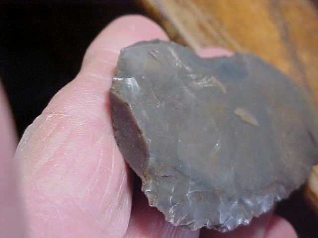 Some artifacts, they don't have to be a G-10, they just have to have "that feel" when you pick them up--guaranteed you'll find it when you hold this Vanderburgh County, Indiana, hornstone knife. Once upon a time there may have been some sort of stem--the flaking patterns tell me it's Early archaic Culture (7500BP), but was it a cornernotched type--that's my 'best guess'--you don't see blade edge beveling so you can rule out Lost Lakes, although the missing stem could have been an early stage Dovetail. Regardless of the culture that fashioned the piece, it just feels GOOD. Length is slightly over the three inch caliper line, width is 1&11/16"--the 3/8" thickness tells of a strong blade--so how'd they break it??? Ancient modifications of the tip area indicate it became a hand-held tool; also, the one side has what looks like (based on the patina change) later period damage. There is enough "re-patination" that I would think some later culture (Woodland) found and utilized the knife. Guaranteed real, period--it's been in my collection for some time, and welcome here for the next thirty years (if I'm still around). Shipping is $8.00, checks, cash, money orders welcomed. Sorry, I do not use paypal-type services--Roy A.