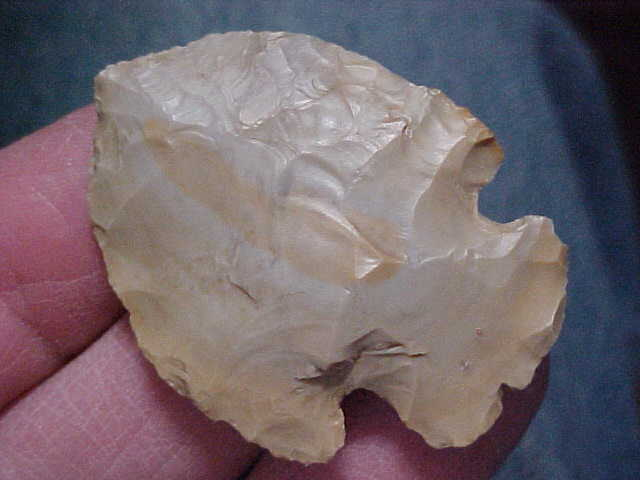 Out of the Massac County, Illinois, area, a Mid Woodland point type I classified as a "Grand Point"--Hopewell related, you can see some similarities to Snyders points in the basal notches--and that the base is not ground. The knapping, though, is more pressure chipping than percussion knapping. The flint is a higher gloss material, its higher silicate content made pressure flaking much finer than percussion, the main face having parallel oblique flake scars--that angle-flaking is some seriously nice work, 1&7/8" by 1&3/8"--thickest spot is 3/8" on a small 'stack'. From what I learned the finder was a riverbank hunter--Ohio River--100% guaranteed authentic. Shipping is $8.00, checks, cash, or money orders are the three payment options. Sorry, I do not use paypal-type services--Roy A.