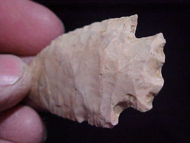Out of Massac County in the 'toe' of Illinois, Ohio River area--three deliberate notches on the basal edge, almost a serration, but was that to keep the knife point steady in it's handle, or did the notching accomplish some other purpose. If there was basal edge grinding to start with it was cut away with the notches--you can feel grinding on the sides of the stem. The Early Archaic Hardin shows excellent pressure knapping, measures 2&5/16" by 1&1/4"--5/16" max thickness. Made of a good quality local flint, good gloss and patina. Real, period. Shipping is $8.00, checks or M.O.s welcomed, but please note I do not use paypal-type services--Roy A.