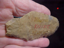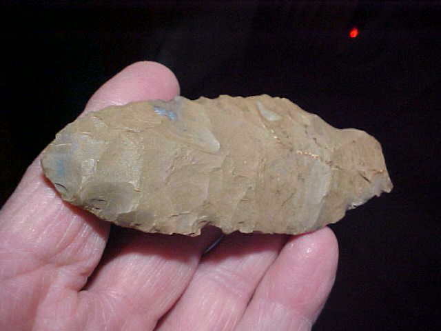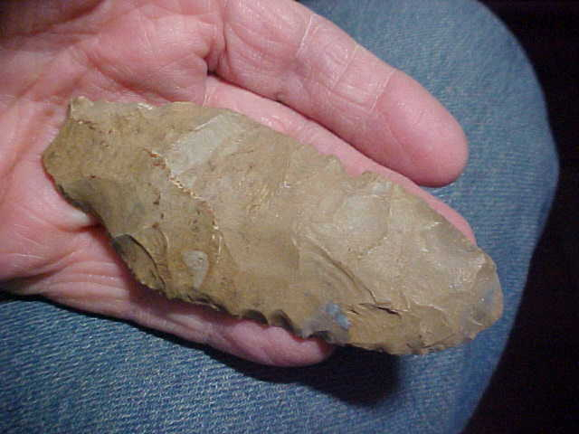 The finder wrote "knife" in some sort of red pencil on the face of the big hafted knife--accurate, as far as that goes. At one time he (in N.C. Indiana) had more provenance as there are twin strips of a glue residue--don't know if the estate auctioneer removed the provenance, they OFTEN (to my disgruntlement) do that--I want the history on a piece any time I can get it. Regardless, I'll provide what I know to the next owner of the very patinated hornstone knife. Length is 4" by 1&5/8", but only 3/8" thickness--for a long knife that's decent thickness. The stem shows any number of ancient modifications, all patinated by age. Identifying the culture that made the knife is a challenge: note the very large flake scars, some reaching and even passing the medial ridge, to me that indicates a very early culture, possibly before Early Archaic, but with the as-found condition of the stem it's hard to be more specific--you decide. Shipping is $8.00, checks, cash, or M.O.s are the ways I welcome payment. Sorry, I do not use paypal-type services--Roy A.