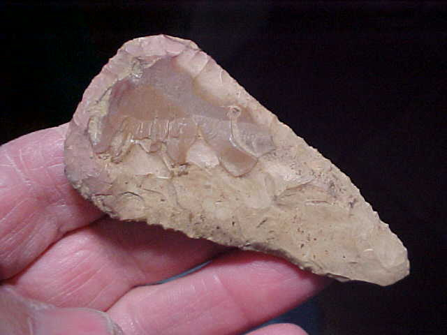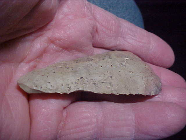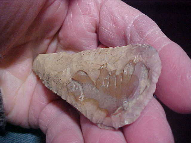 Made of a tan Jasper material (see the brown cortex on the reverse side) 3" by 1&1/2", out of a Tipton, Indiana, based collection. Black speckles of mineral deposit are all over the blade--made by an Early Archaic Culture, a rounded base Cobbs Knife; these were the same peoples who made Dovetails and Lost Lakes. The blade edges show the bevel sharpening that was their touch-up technique--in maybe its last use there was an impact fracture to the tip edge--one side only--that thin edge flake they didn't work back to a cutting edge. At a max thickness of 5/16", the Cobbs is just well made (crafted), shows every sign you could hope for of age--read that as "real, period". Shipping is $8.00, checks or M.O.s are welcomed. Sorry, I do not use paypal-type services--Roy A.