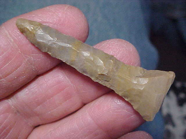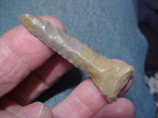 Good flint writes its own story--all I have to do is fill in a few 'blanks'--in this case length--2&1/8", 11/16" across the expanded/ flared base, and 3/8" max thickness to the Indiana Hornstone. The piece comes from a Tipton County, Indiana, area collection. The patina, the 'toning' of the hornstone is no brainer. While there is no damage the piece should show a fracture plane where freeze-thaw action lifted s flake off the shoulder. When water gets into the natural flaws (fault lines), expands, a very smooth fracture plane is left (see the close up). That keeps the price more reasonable, and also shows the authenticity--patina. The drill blade shows excellent knapping skill, the basal edge show some--not greatly ground, but a definitely ground basal edge--I'm unable to say for certain that the piece was Early Archaic Culture, but after the early Archaic basal edge grinding wasn't too common--that cultural affiliation is where I'd place the piece. Shipping is $8.00, checks or M.O.s are welcomed. Sorry, I do not use paypal-type services--Roy A.
