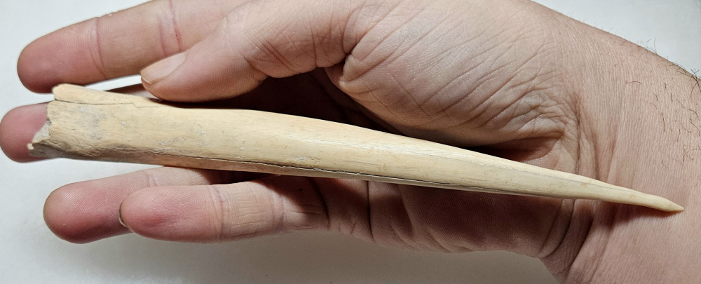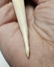 Excellent awl from from an overhang outside of Flagstaff Arizona. Great size and workmanship with a nice polish and deposits. Very interesting tip configuration. Measures 6 inches long.