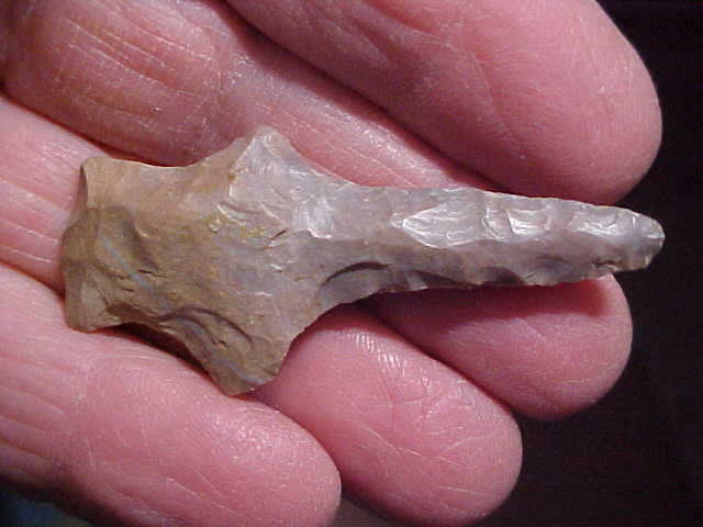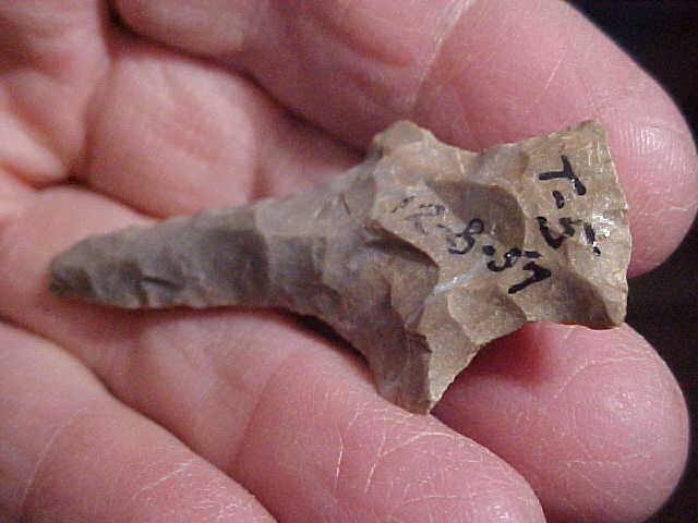 Out of a Tipton County, N.C. Indiana, collection, NICE piece of chert--Liston Creek if I have the identification correct--color, 'waxiness', fracture planes match up with that chert type from north-central Indiana. The piece started off as a Pickwick Point, then use and sharpening of wear resulted in a drill form--very decent drill form. Length is just short of 2&1/4" by 1" width across the barbs, a 5/16" max thickness. The stem, base and sides, have light edge grinding. The finder marked the piece as a 1957 find--well made, real, the two things that matter most. Shipping is $8.00, checks, cash, or money orders are how I welcome payments. Sorry, I do not use paypal-type services--Roy A.