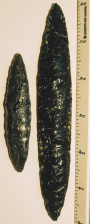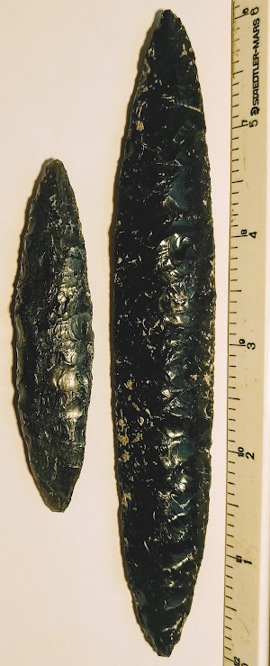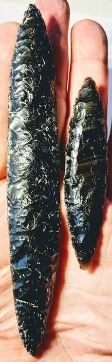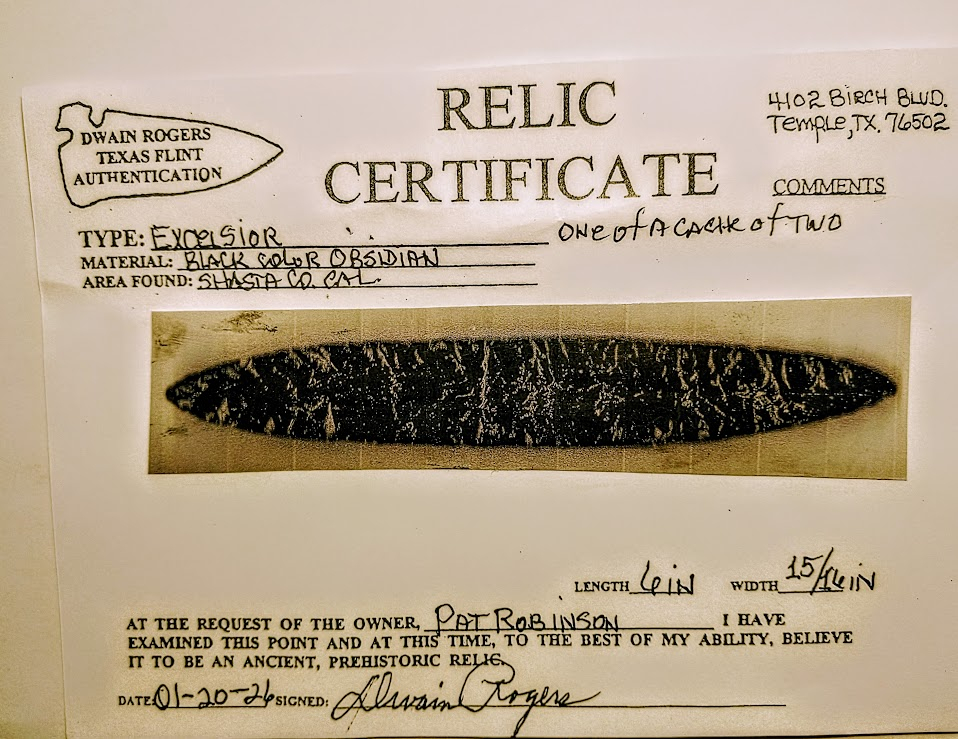 This pair of Obsidian Excelsior Blades was found together as a cache in Shasta Co., California, and they come with a Dwain Rogers COA for each blade. The largest blade is 6" in length, and the shortest is 3.25". The 6" blade appears in the COA photo to have what might be a break at approximately mid-point, but it's simply a hinge fracture. This extremely well-flaked blade is complete, as is the shorter one. It is extremely rare to find a cache of these late Archaic blades, especially containing one as long as 6".
