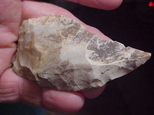 Something about the piece caught my interest--the fluted base, mostly, only a few very early cultures did that sort of basal treatment, Clovis and Dalton being tops among them. The piece comes from the Union County, Illinois, area--Burlington Chert, 3&1/8" by 1&9/16"--a ridiculous thickness of 9/16" because the knife was made off a large, thick Burlington flake. Was the piece functional, or was it a "Training Tool"? That's one for discussion--personally I think some VERY early knapper was teaching a young knapper "Here's how we make a base", he used a flint fragment and watched how the young 'student' worked it. The finished knife shows wear on the blade edges, so YES, it was a functional knife/ perforator--it worked...even if "pretty" wasn't the name of the game. The patina is great, the piece guaranteed real. Shipping is $8.00, checks, cash, or money orders welcomed. Sorry, I do not use paypal-type services--Roy A.