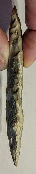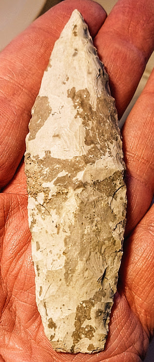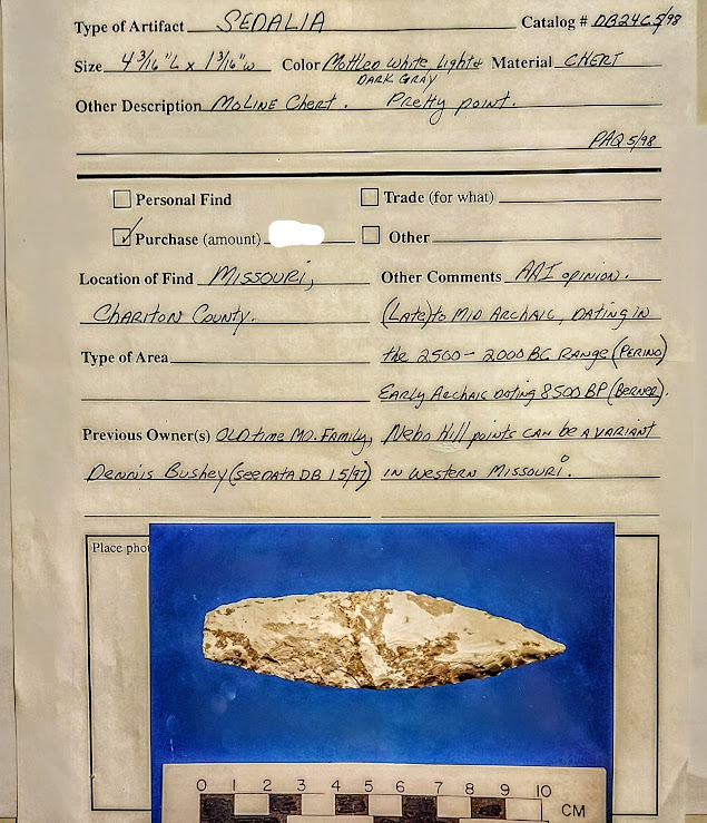 This colorful Moline chert Sedalia point was found in Charleston Co., Missouri. It was formerly in the Dennis Bushy collection and comes with a Dwain Rogers COA. It also comes with an artifact provenance sheet from a prior owner. It's a very pretty point!