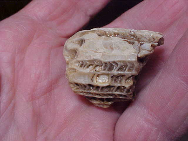 The late B. Wilson's artifact collection included this unusual fossil in with a group of Ohio River-found points and bone awls--the resemblance to an ear of corn gave it a place on the computer monitor stand I stack-up with what catches my collecting interest--it finally got washed of the sandy river soil that was lodged in the coral(?) 'pockets'...so if there's a bit of moisture still there, you'll understand what you're seeing. Length is only 1&7/16", and being slightly rectangular, 1&1/16" by 7/8". If my camera catches it in morning sunlight there are numerous quartz crystals that sparkle--every artifact group seems to carry with it something that leaves you with a "That's neat"--this one from Bob's collection did that. Shipping is $8.00 (sorry, that's as cheap as I can send a box through USPS these days). I welcome checks, cash, or money orders, but do not use paypal-type services--Roy A.