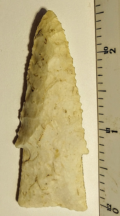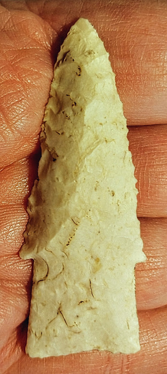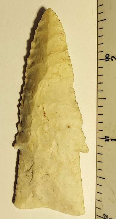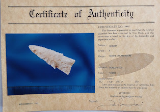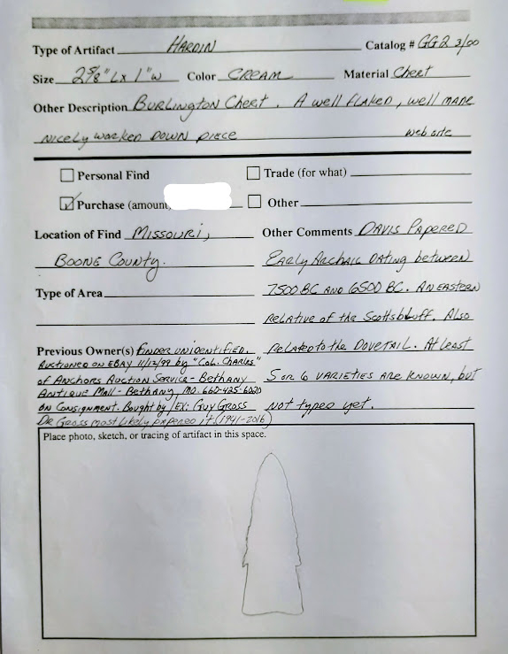 This is a small but very well-made, serrated, and beveled Hardin point from Boone Co., Missouri. It is made from Burlington chert and comes with a G8 Tom Davis COA. This point also comes with a Provenance Sheet from a prior collector indicating it was formerly in the collection of Dr. Guy Gross. This is a first-class Hardin point and has it all!