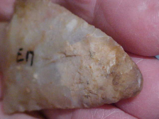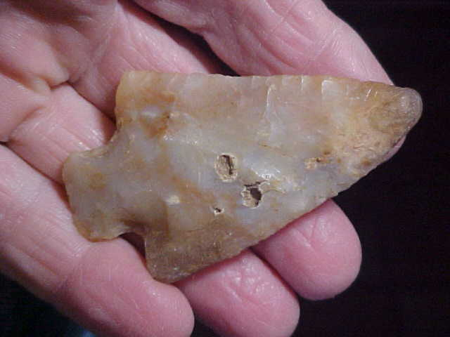 Sold at an auction with absolutely no provenance--the catalog numbers providing no help as they (E" series) was used on all different sorts of flint, Indiana pieces, blades that are either Kentucky or TN, maybe even some Ohio flints--this one I'm making an assumption, and if I'm wrong I'll readily admit it--a heat treated Flint Ridge Late Archaic stemmed point--there being no detectible stem edge/ basal grinding, the Pickwick--Ledbetter point cluster. Length is 2&3/4" by 1&5/8", 3/8" max thickness in the hafting area. The flint is very translucent--see the back-lighted photo--course that also shows the tip and barb restoration, a "waxy" material that's also translucent. In a way the material feels like a silicon--maybe IS, I can only guess at the restorer, the material they used--and how they 'colored' the restoration--decent restoration even if not museum-grade restoration, the tip and barb end too 'blunt' to do more than imitate what the missing pieces were like--bluntness could be dulled from repeated handling, too, lol. The point itself, it's guaranteed real----and as clearly described as I'm able. Shipping is $8.00, checks or M.O.s (plus cash) are the methods I welcome-in payments. Sorry, I use no paypal-type services--Roy A.