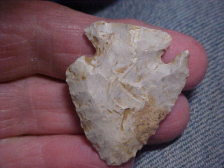 A Warrick County, S.W. Indiana, find made of the Holland Flint out of neighboring Spencer County (Indiana)--inclusions of limestone 'cherty grade' material as some "Holland" shows--like many flints there are super grades, there are cherty grades, it just depended on the minerals percolating down into pockets of the coral reefs from the three hundred million year old "Inland Sea". Many--if not most--Midwest flint deposits are the result of those former coral reefs, flint color and fossils depended on what settled in those pockets in a reef (think of caves, stalagmites, same deal--even if that's simplifying the process some). This Early Archaic point is size-reduced to slightly over 1&1/2" by 1&5/16"--a quarter inch max thickness. Basal grinding and bevel sharpening are both light enough that I'd call the piece a Pinetree--possibly even Charleston Points (sort of a cross between a Pinetree and a Lost Lake). One barb has ancient damage, but decent shape overall, REAL. Shipping comes with the listed price, checks or M.O>s are welcomed. Sorry, I do not use paypal-type services--Roy A.