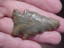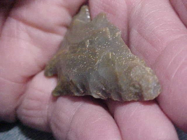 A Spencer County, Indiana, cornernotched Pinetree--some, not heavy, basal edge grinding. Considerable use shows in the blade sharpening on the upper half of the point--percussion chipping that contrasts to the pressure chipping the lower blade shows (and the finely made base). The last use the knife (or dart) made contact with snipped-off the tip. I will not rule out some culture that was considerably later than the Early Archiac maker having found and utilized the piece--you see far more streambed polish from washing sand and gravel that the tip area shows--the tip is NOT new chipping, but it is a less polished surface than the basal area. WE walk creeks to find flint--THEY walked creeks searching for deer--human nature, you find a usable tool, you take it home--we do--they did. Shipping is $8.00, checks, cash, or M.O.s are the three payment options. Sorry, I do not use paypal-type services--Roy A.