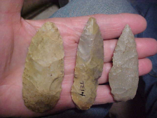Three flint knives, the longest is 3&3/8"--next is 3&3/16", and 2&13/16"--the longest and the smaller blade are made of grades of Hornstone--middle-sized knife I can't say for certain as the last collector didn't label his artifacts--he was in N.C. Indiana, but the blades look like they're either southern Kentucky or Tennessee. I asked the auction people if they had more info they could provide, got a "How the .... would we know?" Some auctions are good about provenance, others leave you to study the piece, the patina, minerals present on the surface (iron staining on the longest piece is what you'd expect on KY and TN points, that red clay, rich in iron, so widespread in those two states). The trio are each real in every detail--THAT is clear. Shipping is $9.00--apologies for the high shipping cost but the USPS seems to be in a constant price increase cycle. I welcome checks, cash, or M.O.s, but do not use paypal-type services--Roy A.
