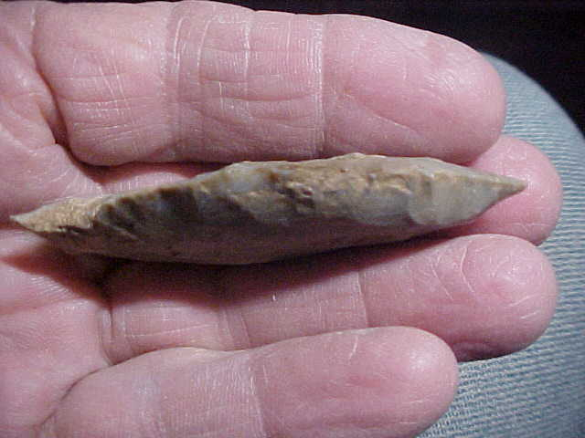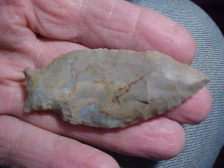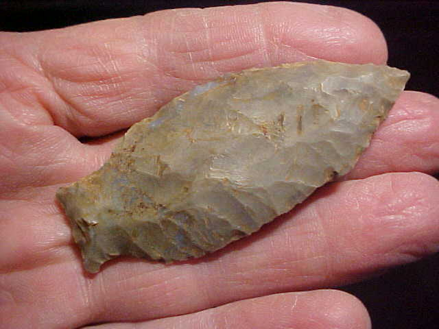 Made of hornstone, this Warrick county, Indiana, Benton Bottle Neck is 'Overstreet typical" for these Mid Archaic (6500BP) Bentons--it even has some degree of the transverse knapping scars that make Bentons and Elk River points so collectible. That (to me) was some of the highest skilled flint knapping of any culture--"ribbon flaking" is how one old collector I learned from described it. Being Mid Archaic, there is naturally no stem grinding (basal edge), but I can find some dulling on the sides of the stem--not a great deal, but it was important for the sharp edges to be dulled, not cut through the sinew that was used when hafting the knife. Length here is just under 2&3/4"--likely started as a considerably longer knife--5" Bentons--or more--are not unusual if you find one before the blade was repeatedly sharpened. Width is 1&1/8"--again, that's what you'd expect from this culture--near the tip the thickness reaches 7/16", so that's another indicator the blade was considerably longer (stage one form). The knapped fashioned a needle tip, and as it wasn't worn-down you know the blade was lost shortly after the last sharpening--i.e. no weardown. GREAT patina, guaranteed authentic in every possible detail. Shipping is $8.00, checks or M.O.s are how I welcome payments--sorry, I do not use paypal-type services--Roy A.